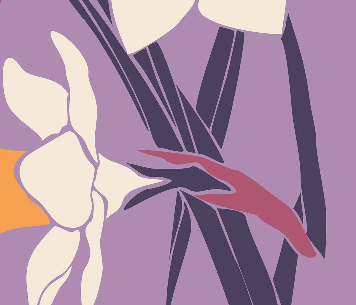MORYARTY · 2021 · Energetic floral market poster with bold orange field and graphic blooms in pink and purple